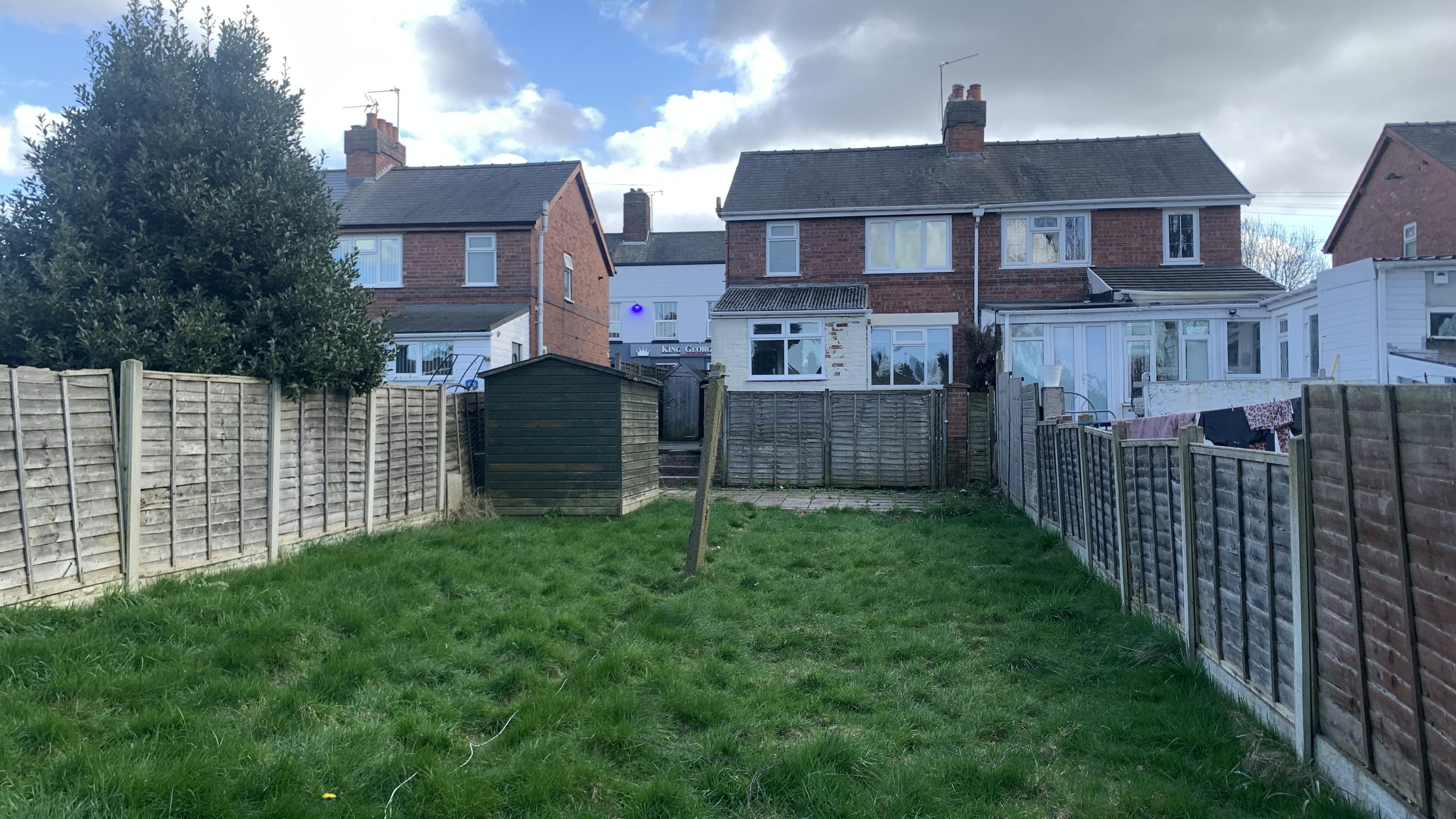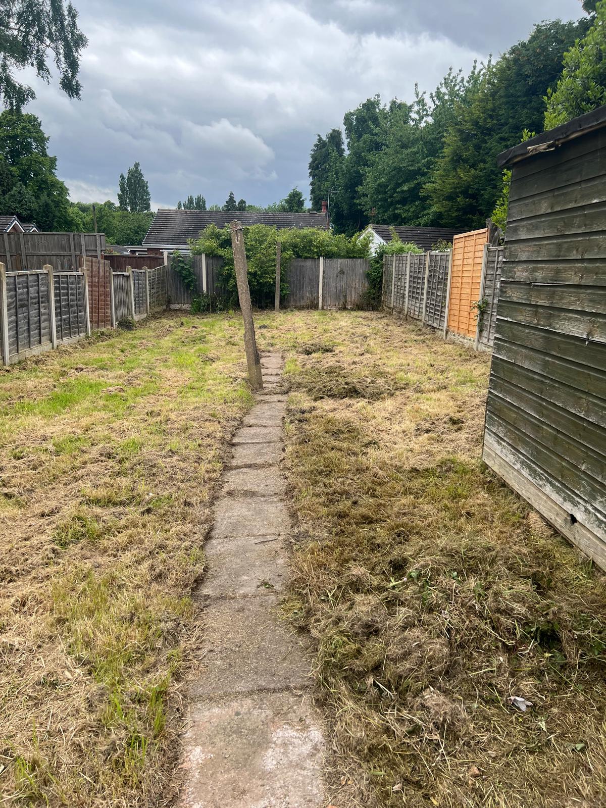 Paved patio area and being mainly laid to lawn for the remaining section, boundary wooden fence panels and wood built outbuilding.