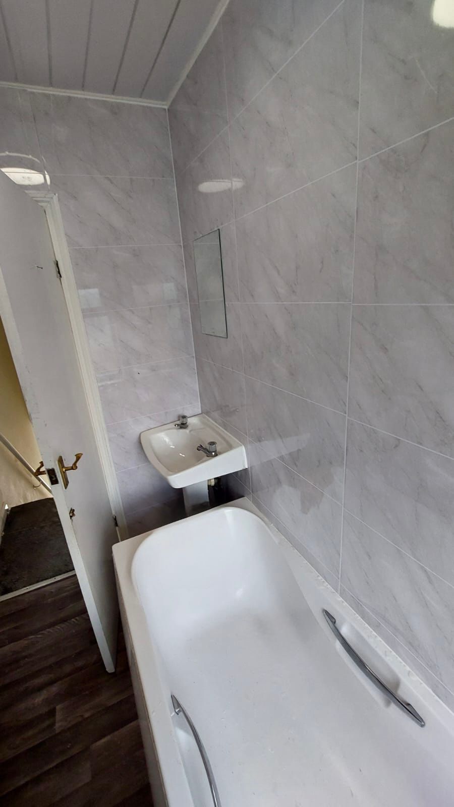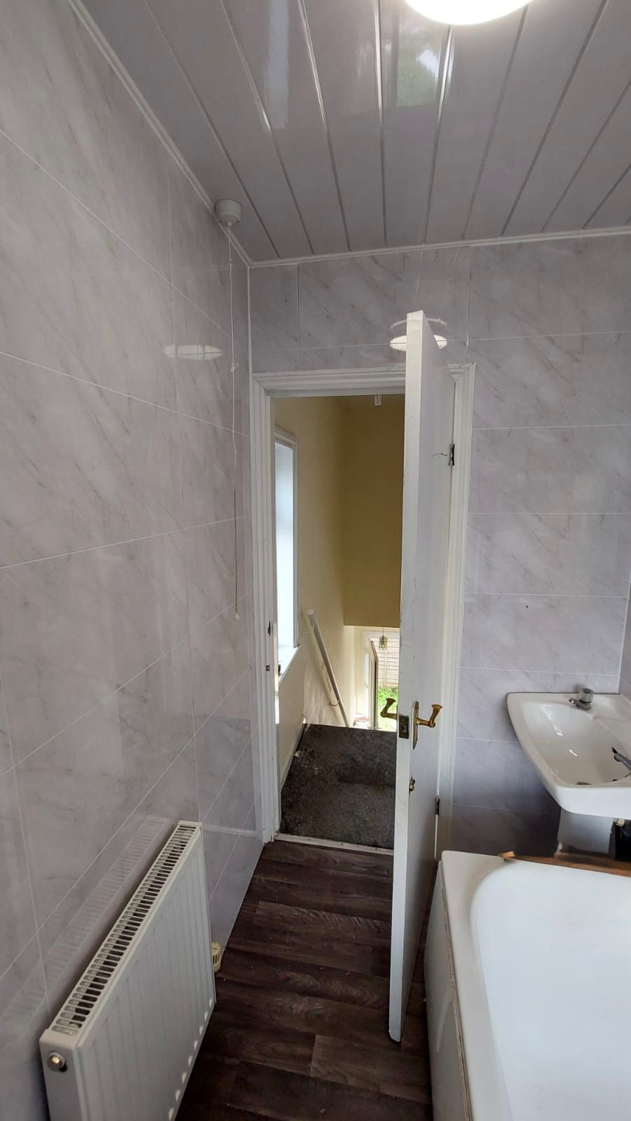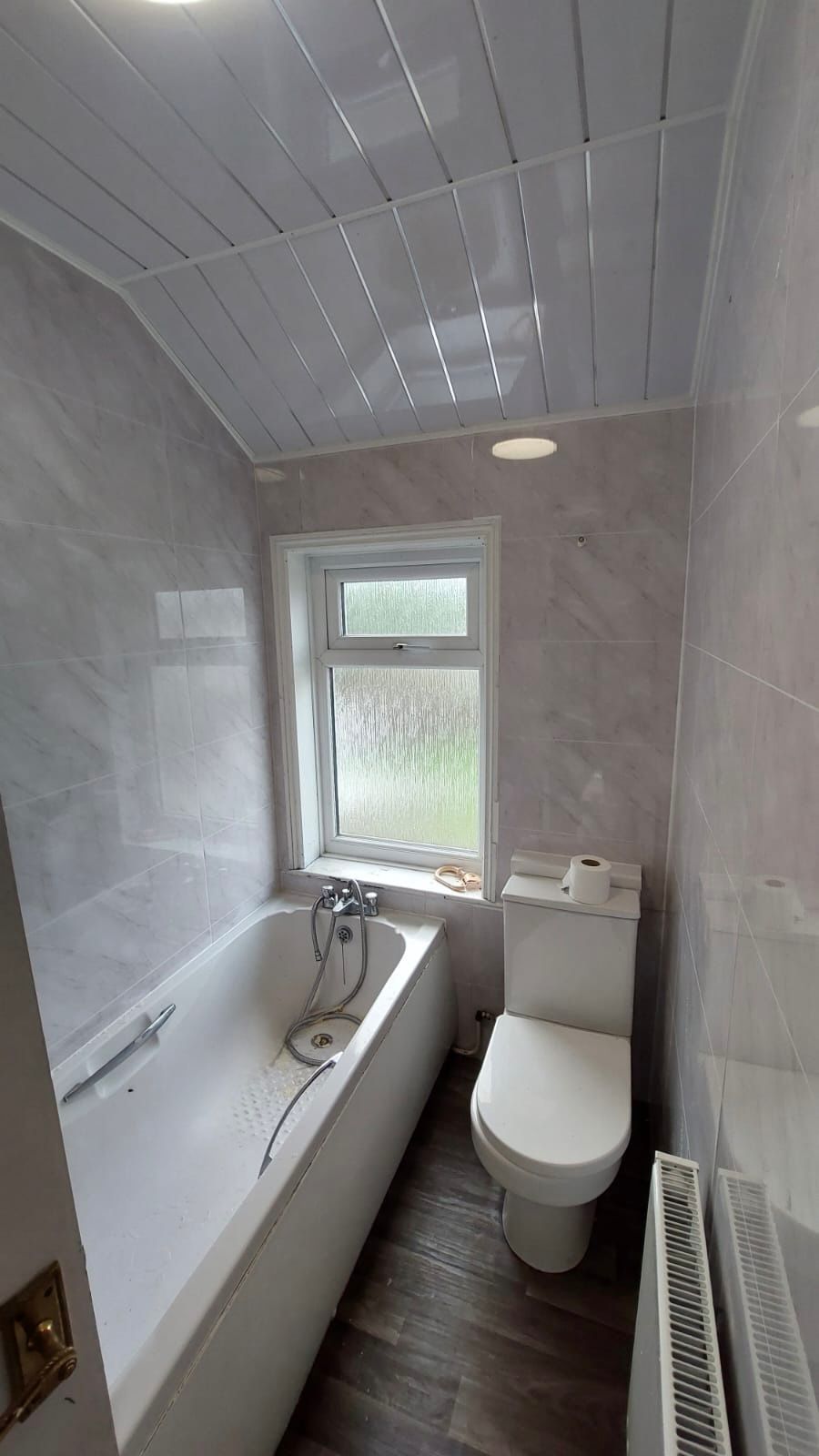 UPVC double glazed frosted windows to the rear elevation, White bathroom suite consisting of a panelled bathtub, wall mounted pedestal hand wash basin, coupled toilet with low level flush, wall mounted gas central heating radiator.